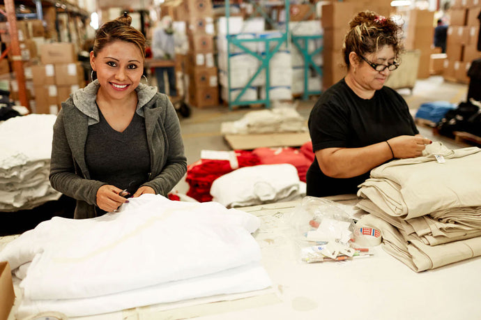 Our products are manufactured to order to reduce excess inventory and are ethically produced in Los Angeles, CA with fair wage practices. Our garment workers earn $15.50-$20.00 an hour, and we support the fight for a minimum wage of $25 an hour across the United States.